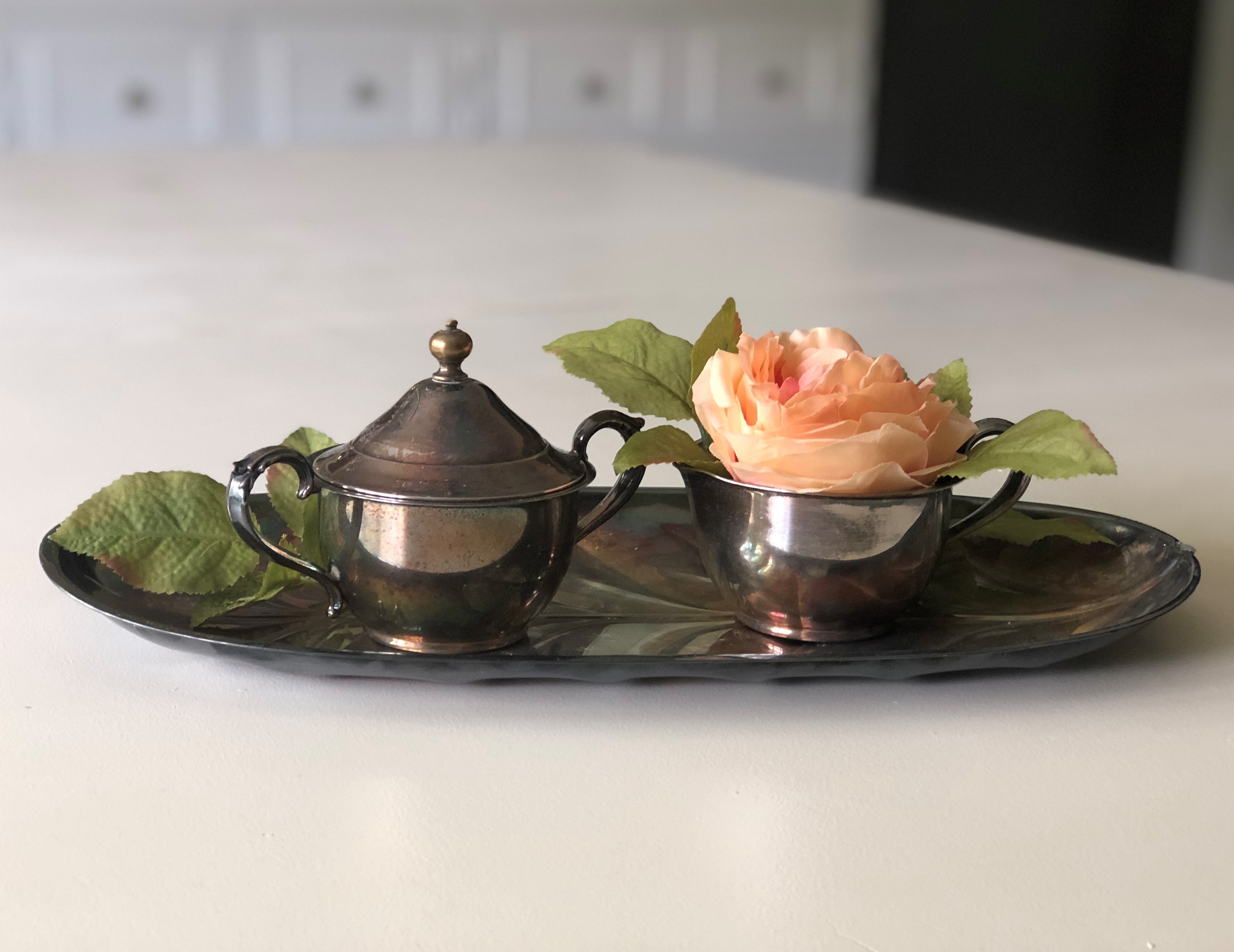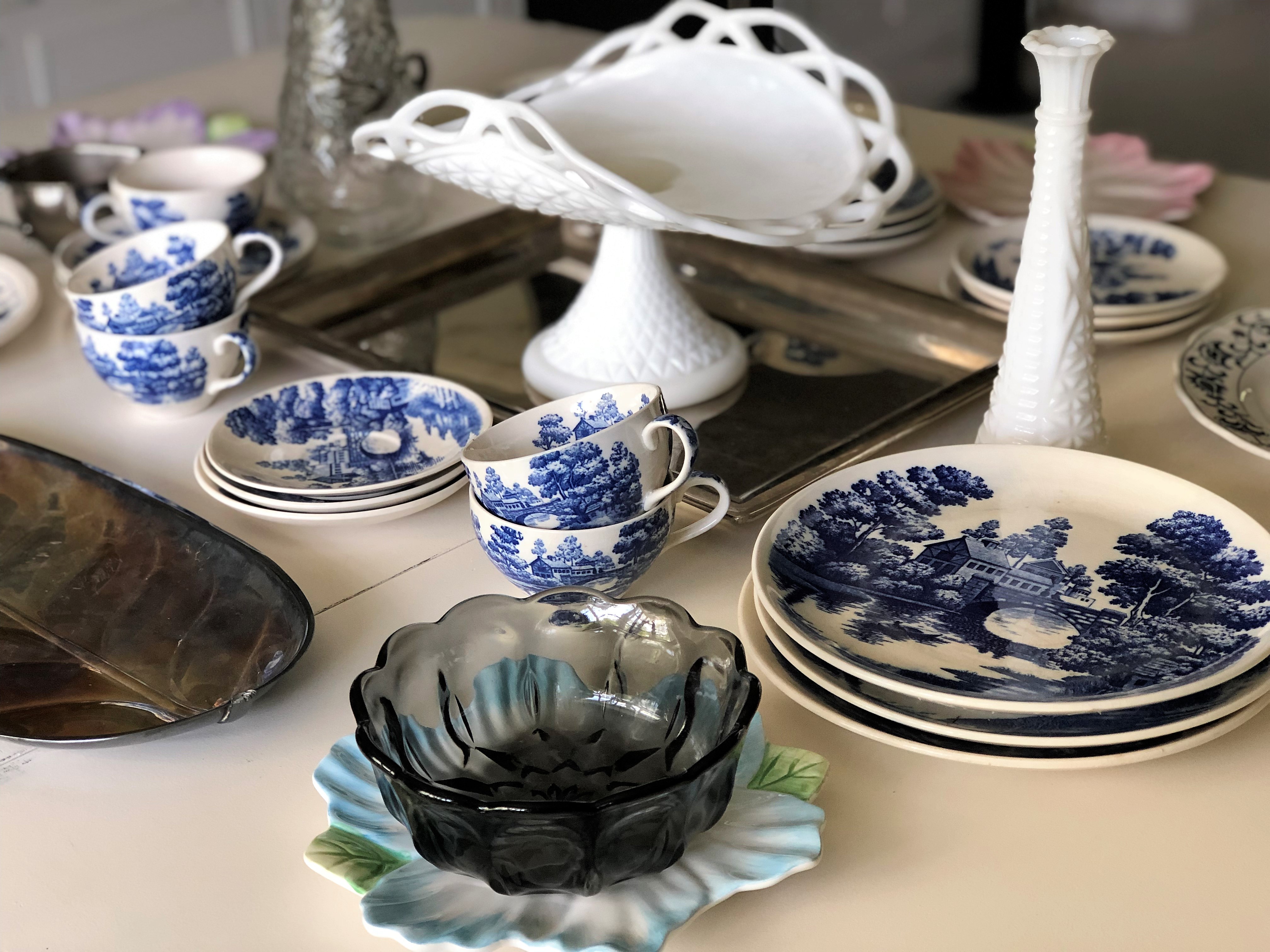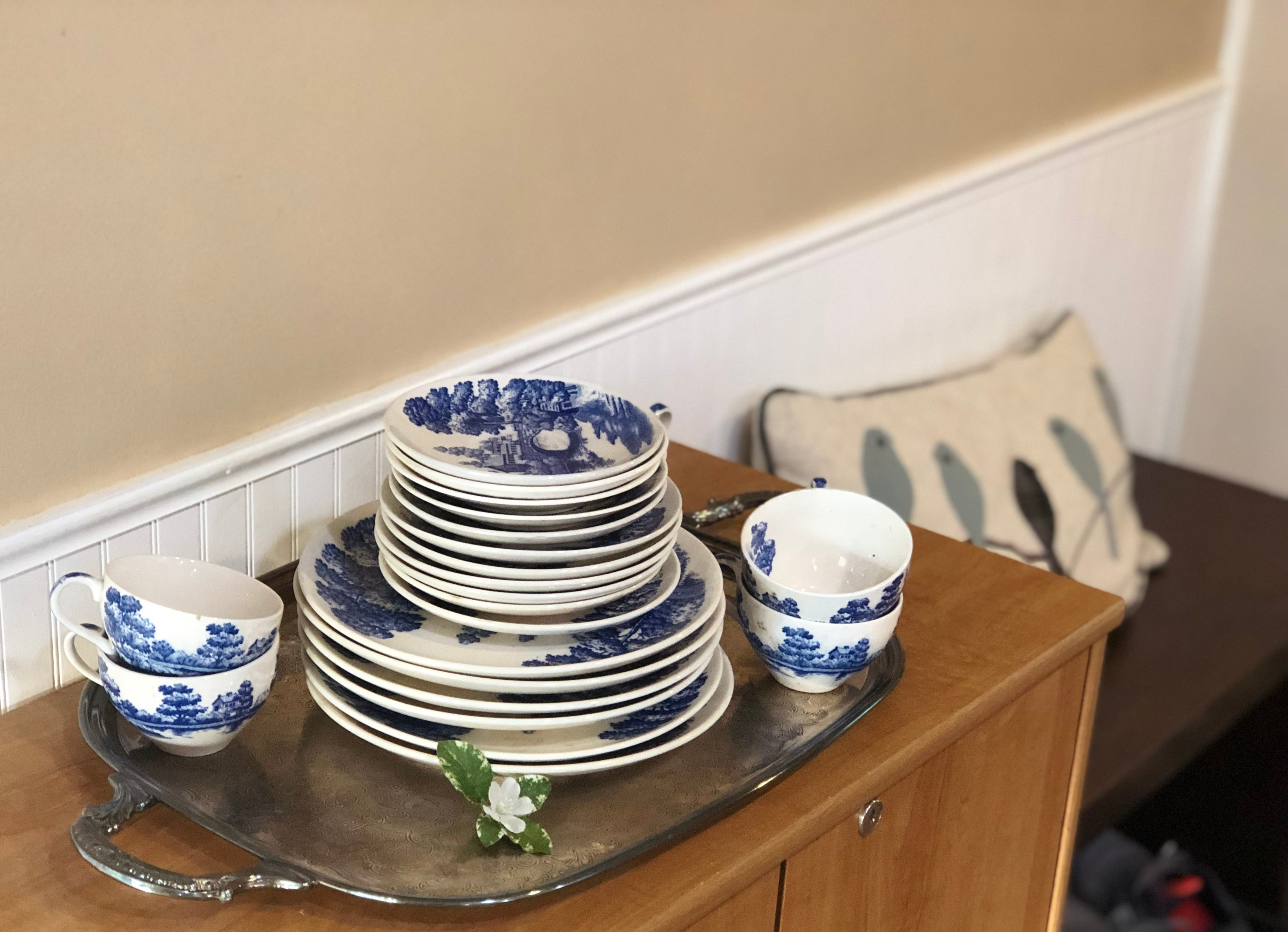 I wasn’t quite sure what I was going to do with the blue and white china set I picked up, but I really loved the scenic pattern and workmanship that went into them. These were hand painted by a company from Japan called Nesco in the pattern known as Lakeview probably around the 1950’s. After cleaning them up with soap and water, I placed them on this silver tray by the back door in my kitchen. I thought it would be the perfect spot to keep them out of the way until I did decide what to do with them. I think its an unexpected way to keep your keys, spare change, or what ever little odds and ends you bring in from the day that get dropped off by the backdoor.