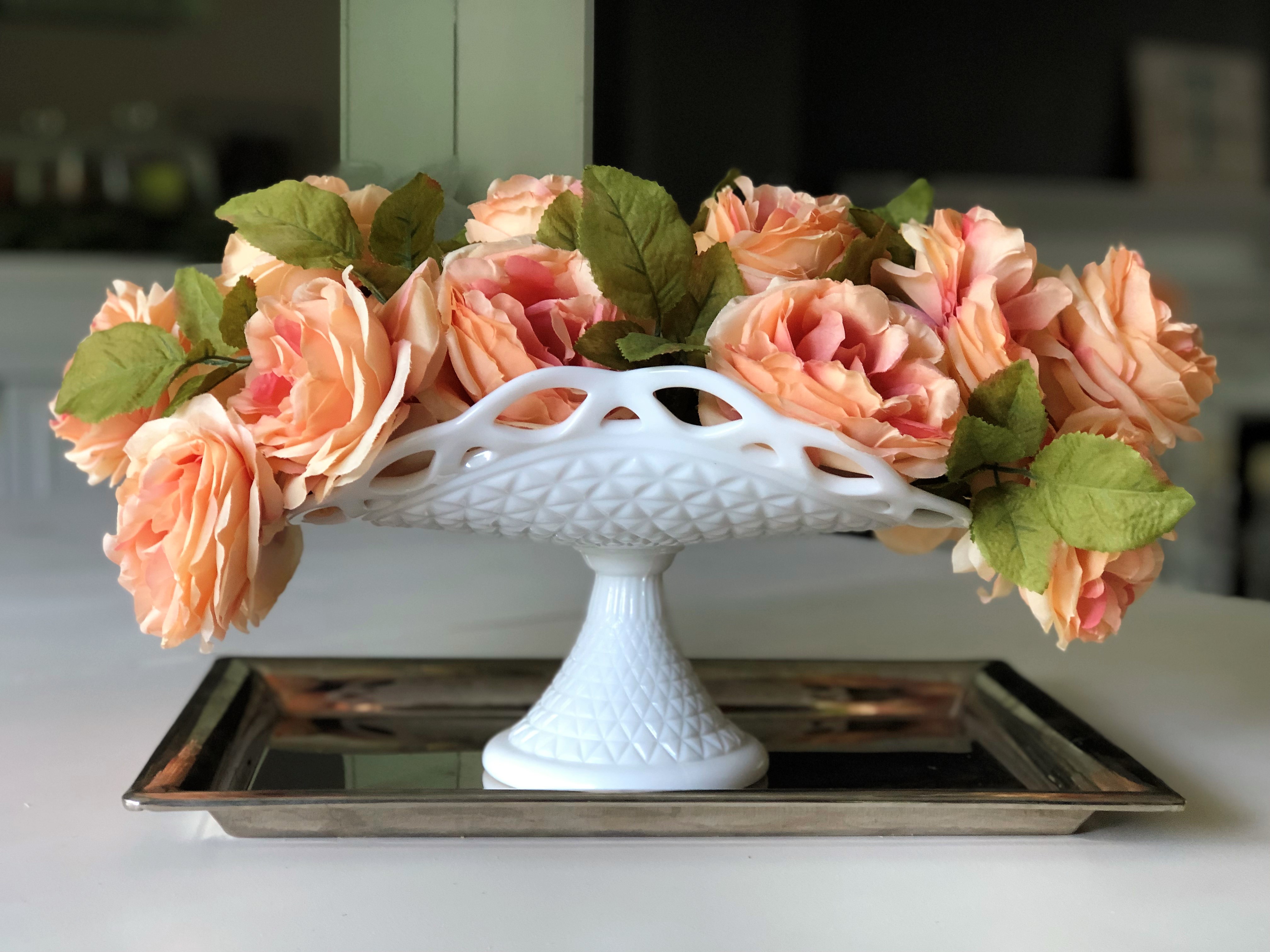 Many of the Victorian items like the banana stand became popular again in reproductions of milk glass pieces like this one from the 1950’s made by the Imperial Glass Company. Instead of using it for bananas, I decided to display it on my dining room table with peach roses standing on a silver tray.
