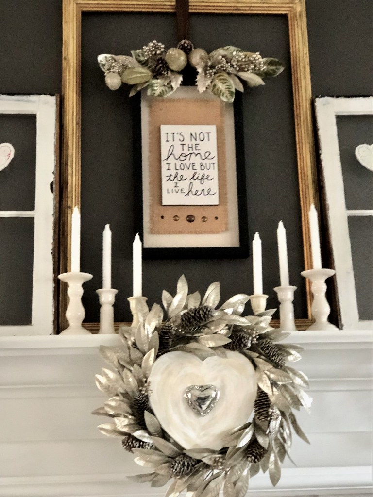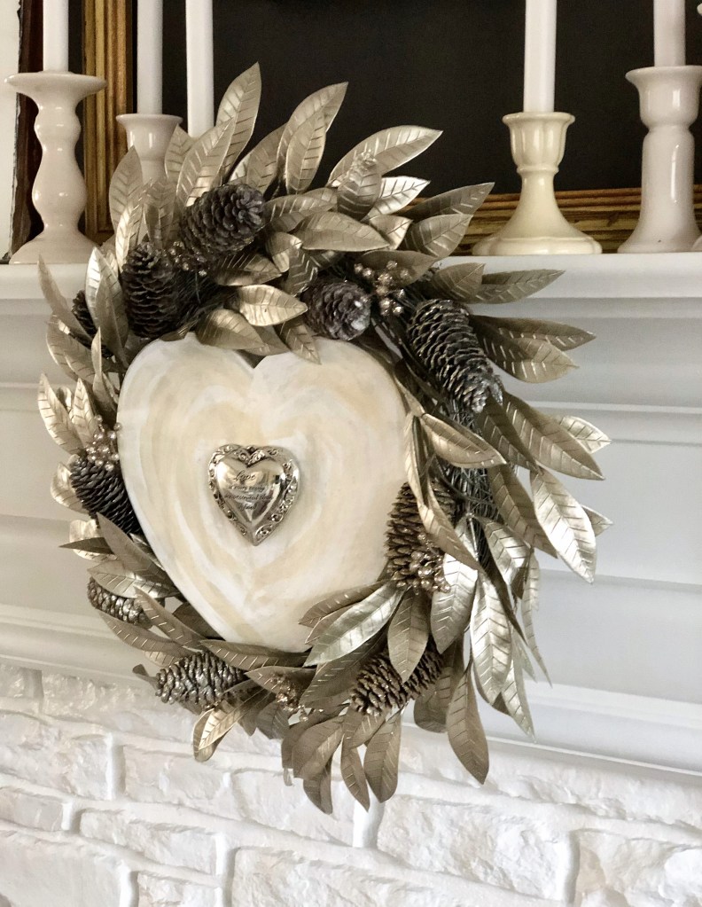 The wreath is, also, left over from Christmas. I added the heart in the center, which is actually a lid from a paper mache heart-shaped box. It was already painted in the creamy white distressed finish and fit perfectly within the wreath. The only thing I added was the silver filigree ornament with hot glue to the center of the box before placing it in the wreath.