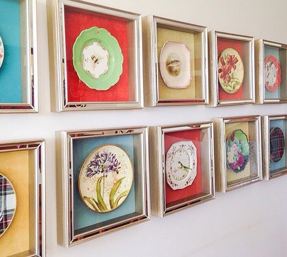On tried and true collectible that most people do hang on the wall, are their plate collections. I found some neat ideas with framing them in or placing them in shadow boxes. Why not use your tea cup collection as planters for some lovely flowers or frame them out for three dimensional art.