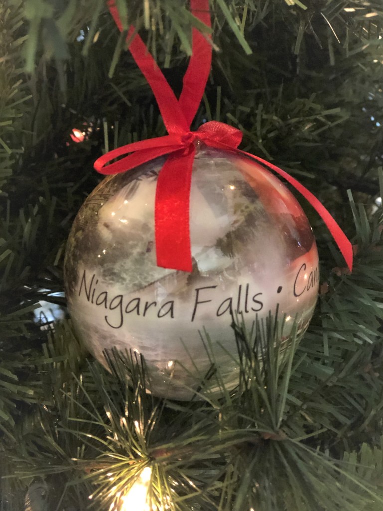 The castle is from a trip to Disney World in Orlando, Florida, which is truly an adventure. On another occasion, we visited the sites of Niagara Falls and picked up this ball ornament featuring the Horseshoe Falls.