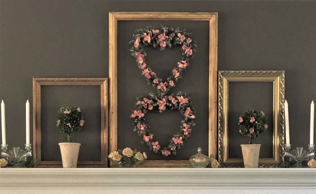 I decided to continue the pink and green theme for Valentine’s day in my living room. With the dark walls and vintage bronze and gold frames, the fireplace mantel has a Victorian feel without being too busy or cluttered. Instead, the heart wreathes and topiaries along with the vintage pieces are appealingly romantic but not in a kitschy way.