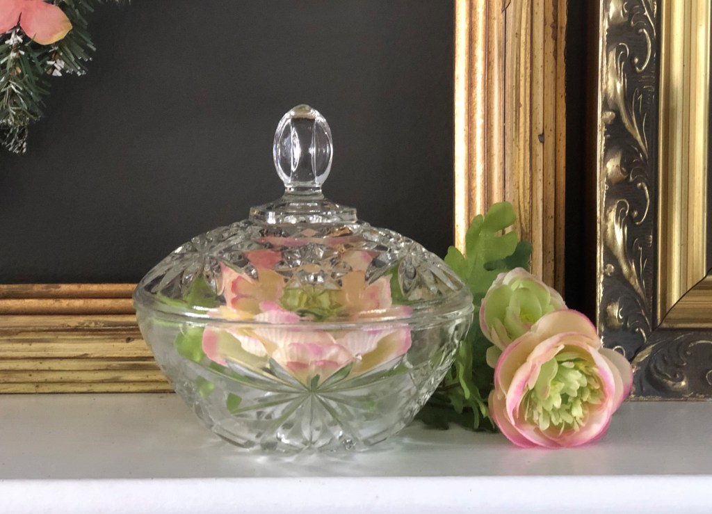 I included these vintage depression glass pieces along with the candlestick holders to add some more sparkle to the display. The boat bowl and covered candy dish were both made by Anchor Hocking Glass Co. around the 1960’s.