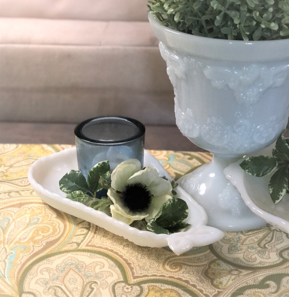 Here are some more nature inspired decorating ideas with milk glass from my Home On Elderwood. Some of these items are for sale in my Etsy shop.